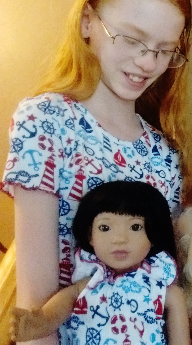 | Here are the girls, getting ready for bed in the matching pjs I found for them. Starpath Dolls doesn't sell matching girl and doll outfits (maybe that could be in their future?) but they do sell a variety of other dolls styles, plush toys, and personalized books. |